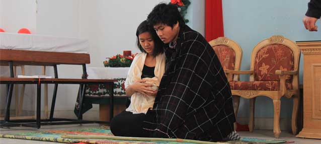 Celebrating the birth of the Prince of Peace, the pastor reads out passages from the Bible: Luke 2:11 and Isaiah 9:6. He guides the congregation in responsive reading. Allowing some moments to hang on for a quiet contemplation, he opens the worship service with a prayer.
